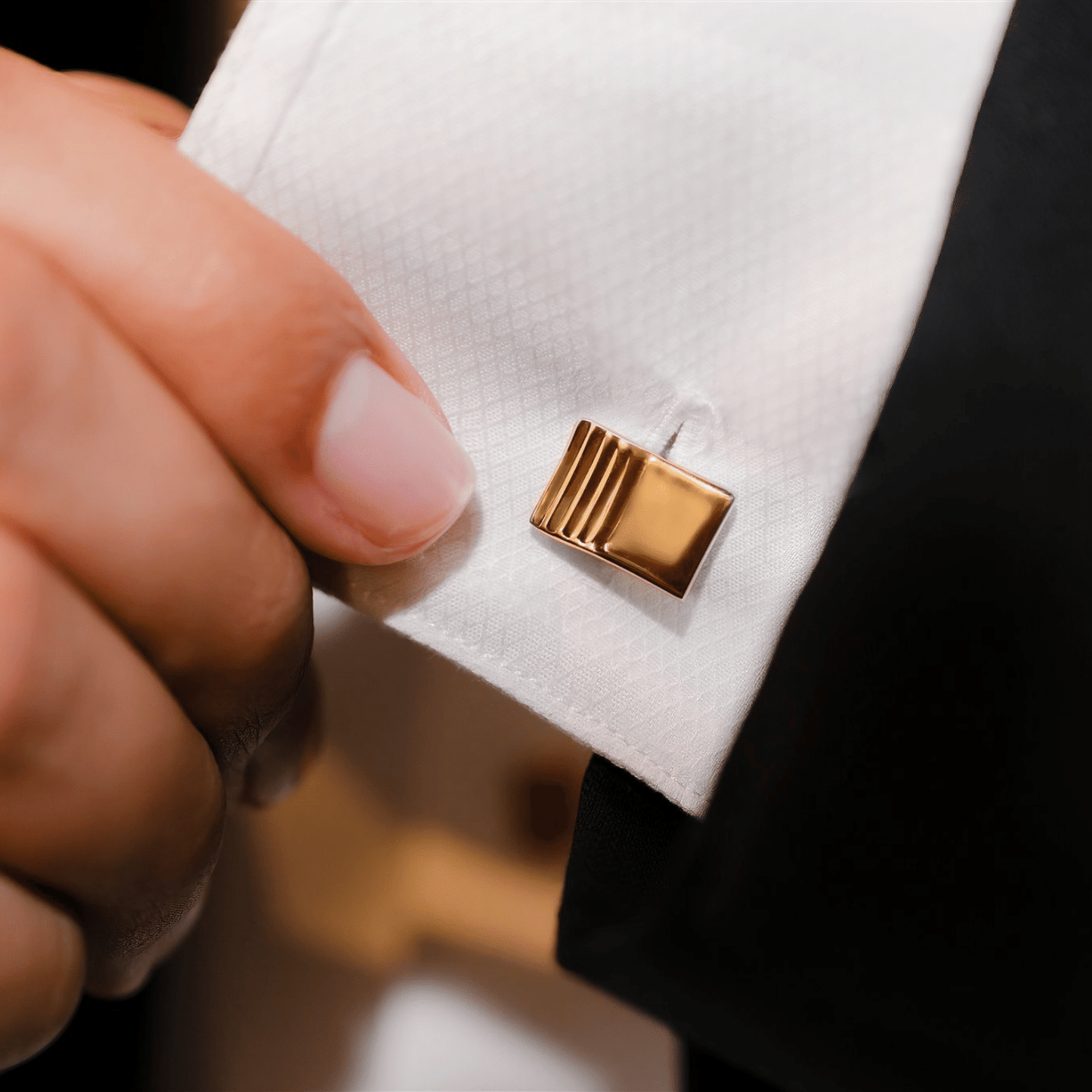 Our unique layered square style is now available in a sleek set of gold cufflinks. This layered square cufflink pair is gift-ready in the signature navy VUE by SEK box. This set is a tiny luxury that will become an instant classic.