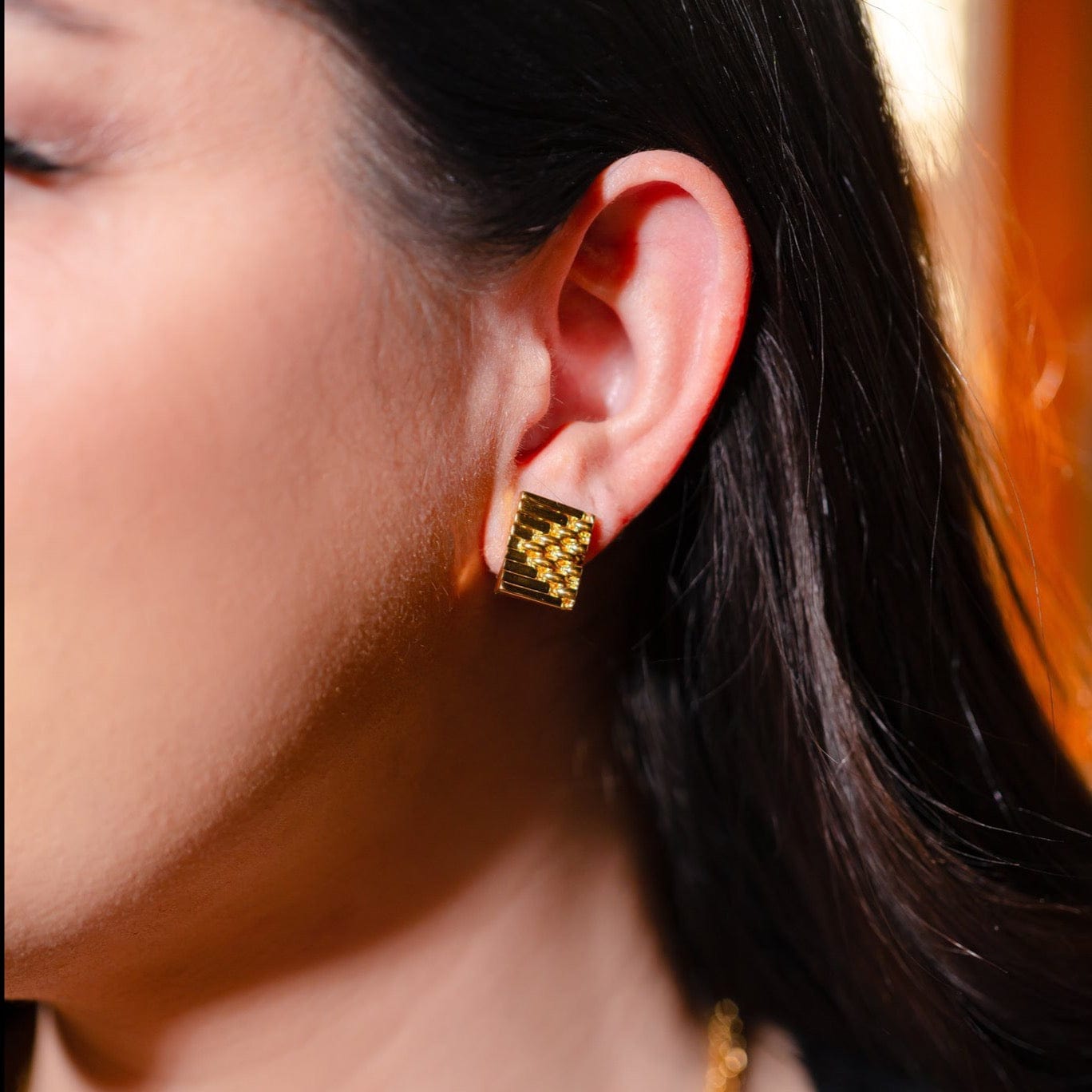 Details: 14k yellow gold plated textured rectangle studs 0.6" x 0.45"